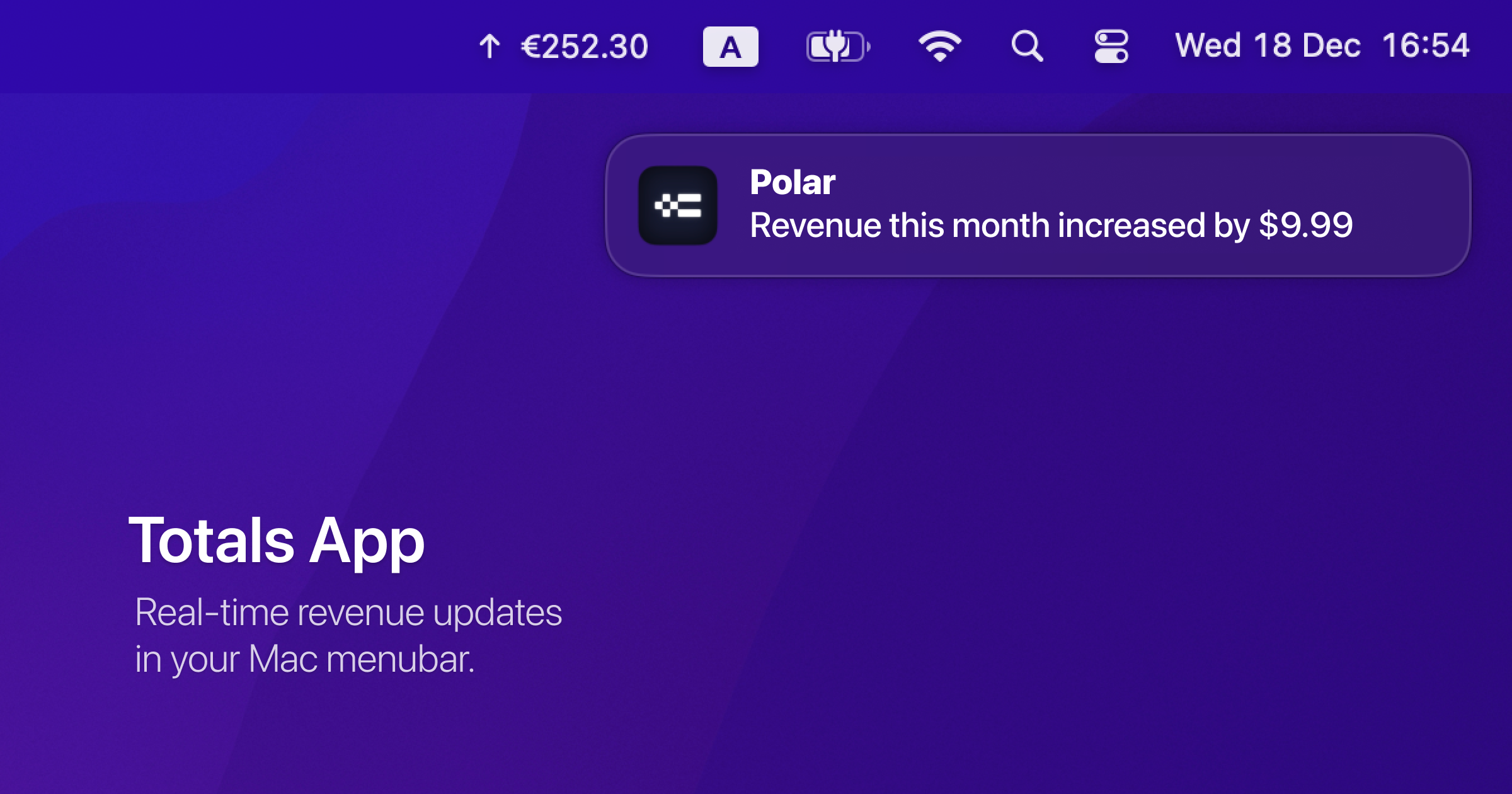 | Long Description | Totals is a macOS menubar app that tracks your revenue in real time from Stripe, Paddle, Gumroad, Lemon Squeezy, and Polar. Seeing live revenue updates might seem small, but it’s surprisingly motivating. No dashboards or logins, just your earnings at a glance. It even adds a bit of fun with optional sounds, confetti, and notifications for new revenue. |